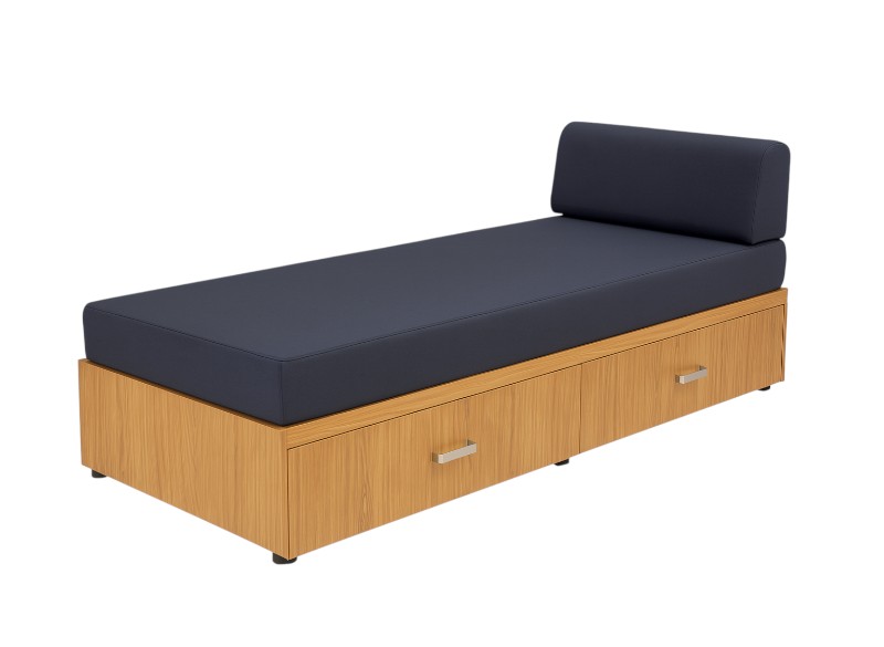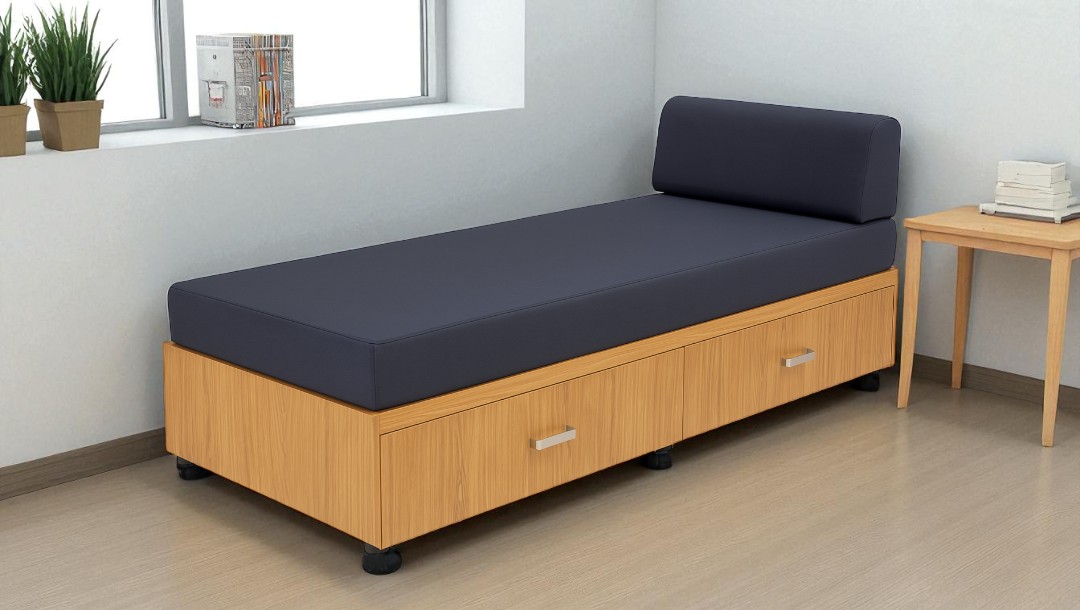 This version includes integrated storage drawers built into the base, offering a convenient space to store bedding, medical supplies or personal items. The drawers glide smoothly and are constructed with durable Laminex laminate for easy cleaning and long-term use. It’s a smart option for environments where space and organisation are a priority, such as health rooms or school facilities.